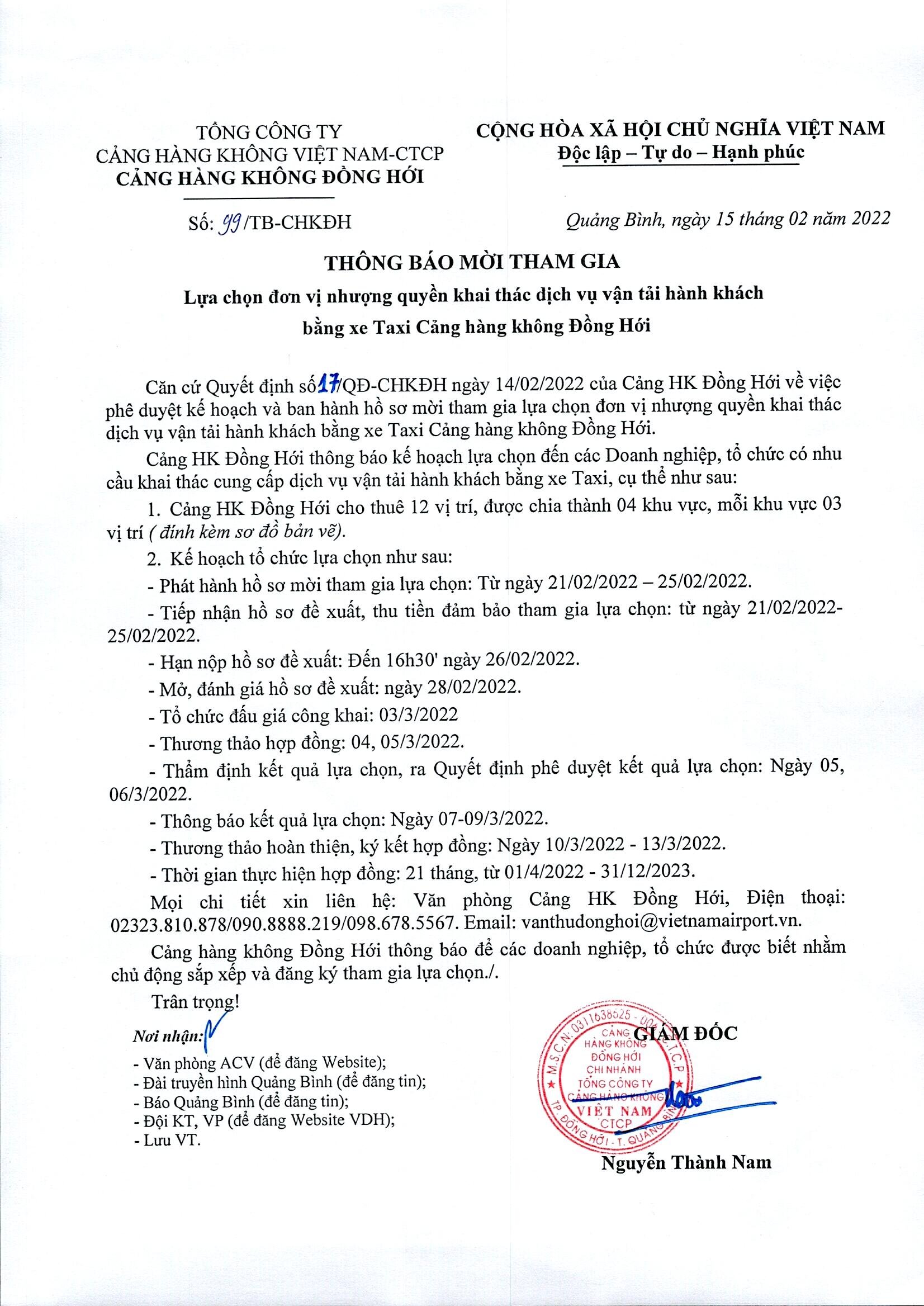 Thông báo mời tham gia lựa chọn đơn vị nhượng quyền khai thác dịch vụ vận tải hành khách bằng xe Taxi Cảng hàng không Đồng Hới