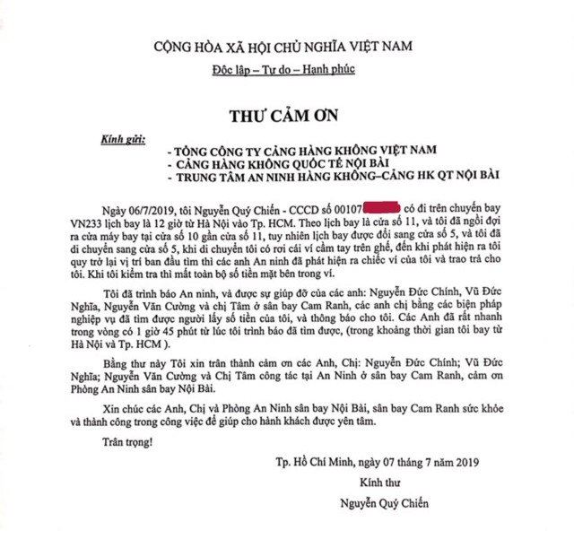 Ngày 08/7/2019, Cảng HKQT Nội Bài nhận được một lá thư cảm ơn của hành khách Nguyễn Quý Chiến chia sẻ một câu chuyện mà anh cảm kích.