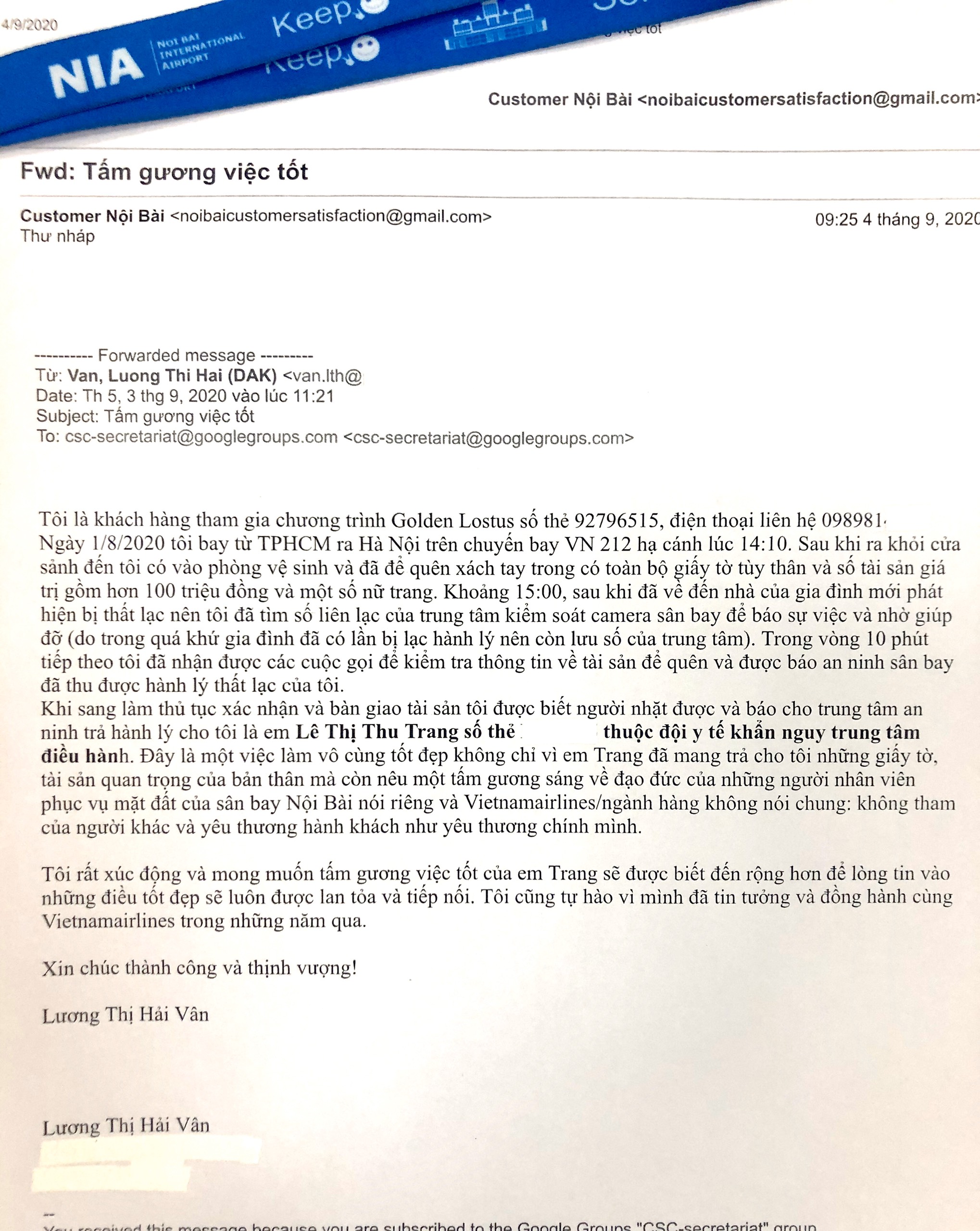 Bức thư của khách gửi đến Cảng HKQT Nội Bài ngày 3.9.20
