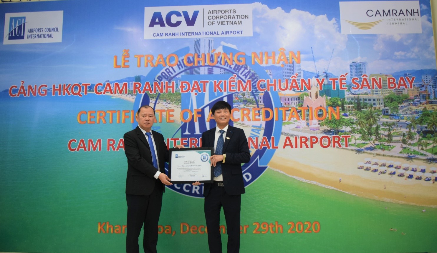 Ngày 29/12/2020, Hội đồng sân bay quốc tế (ACI) đã tổ chức lễ trực tuyến trao chứng nhận Airport Health Accreditation (AHA) cho Cảng HKQT Cam Ranh. Đây là sự công nhận của ACI đối với Cảng HKQT Cam Ranh trong việc đảm bảo quy trình an toàn chống dịch trong hoạt động khai thác tại sân bay.