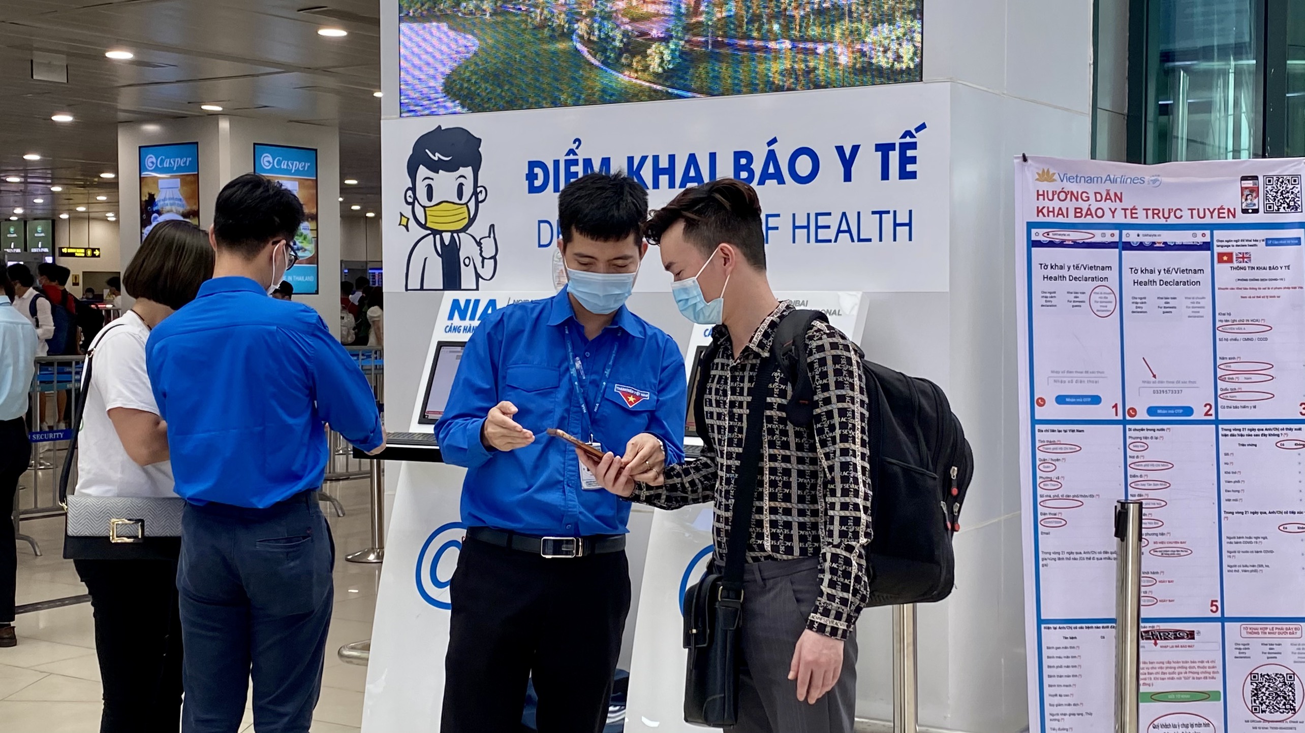 Ảnh: Thanh niên tình nguyện hỗ trợ hành khách khai báo y tế
