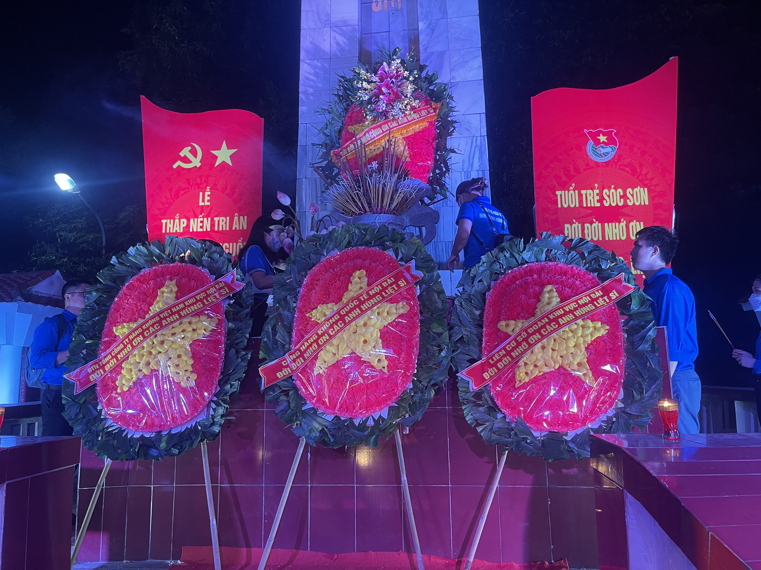 Buổi tối cùng ngày, đồng chí Hoàng Thanh Quang - Phó Bí thư Đảng ủy, Phó Giám đốc Cảng HKQT Nội Bài làm trưởng đoàn, cùng đồng chí Nguyễn Hà Thanh Chủ tịch Hội đồng Bí thư Liên cơ sở Đoàn Nội Bài, Phó Bí thư Đoàn thanh niên Tổng công ty Cảng hàng không Việt Nam, Bí thư Đoàn Thanh niên Cảng HKQT Nội Bài cùng các đoàn viên thanh niên các đơn vị tại Nội Bài tham gia chương trình “Thắp nến tri ân” do Huyện Đoàn Sóc Sơn tổ chức tại Nghĩa trang liệt sỹ xã Mai Đình. Tại chương trình, các đại biểu cùng tuổi trẻ Liên cơ sở Đoàn Nội Bài đã dâng hương tưởng niệm và tri ân đến các Mẹ Việt Nam anh hùng, thân nhân liệt sĩ, gia đình chính sách, gia đình có công với cách mạng, thương bệnh binh với 200 suất quà, trị giá 100 triệu đồng; dâng hương, hoa tại 173 phần mộ liệt sĩ tại nghĩa trang liệt sĩ xã Mai Đình.