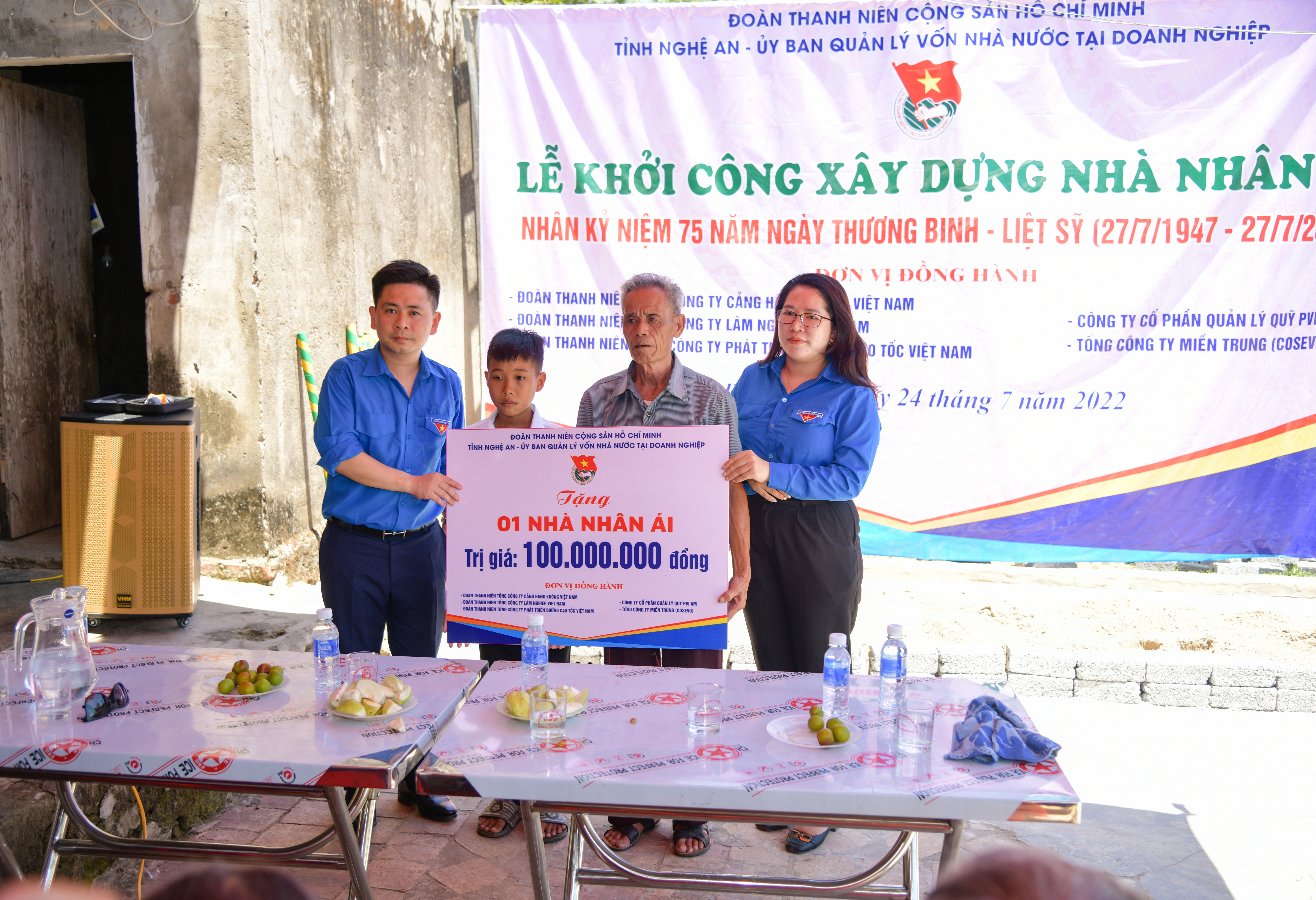 Ngày 24/7/2022, Đoàn viên thanh niên Cảng HKQT Nội Bài đã phối hợp với Đoàn Thanh niên: Ủy ban Quản lý vốn nhà nước tại Doanh nghiệp, Tổng công ty Lâm nghiệp Việt Nam, Tổng công ty đầu tư phát triển đường cao tốc Việt Nam, Tổng công ty Miền Trung (COSEVCO), Ban Thường vụ Tỉnh đoàn Nghệ An, lãnh đạo Huyện Thanh Chương và Ban quản lý khu di tích Truông Bồn tổ chức lễ khởi công xây dựng nhà tình nghĩa cho chị Trần Thị Thanh, là người thờ phụng 2 liệt sỹ và Mẹ Việt Nam anh hùng tại Huyện Thanh Chương; khởi công xây dựng nhà nhân ái cho gia đình em Nguyễn Công Hà, gia đình thuộc diện hộ nghèo được Chi bộ Truông Bồn nhận chăm sóc với mức hỗ trợ mỗi nhà trị giá 100 triệu đồng; trao tặng 15 suất quà mỗi suất trị giá 1 triệu đồng cho người có công với cách mạng tại huyện Đô Lương và Thanh Chương. Thay mặt đoàn công tác, đồng chí Nguyễn Hà Thanh – Phó bí thư Đoàn Thanh niên Tổng công ty Cảng hàng không Việt Nam, Bí thư Đoàn Thanh niên Cảng HKQT Nội Bài chia sẻ: “Công tác đền ơn đáp nghĩa, chăm sóc thương binh, thân nhân liệt sĩ, người có công và công tác an sinh xã hội đều là những nhiệm vụ chính trị lớn của Đảng, Nhà nước, của các tổ chức chính trị xã hội, trong đó có Đoàn TNCS Hồ Chí Minh. Hướng tới Kỷ niệm 75 năm Ngày Thương binh - Liệt sỹ, Tỉnh đoàn Nghệ An phối hợp với Đoàn Thanh niên Ủy ban Quản lý vốn Nhà nước tại doanh nghiệp cùng với các đơn vị đồng hành tổ chức Hành trình tri ân tại Nghệ An là một hoạt động hết sức có ý nghĩa. Nhờ sự kết nối của Tỉnh đoàn Nghệ An, đoàn công tác đã có mặt tại đây với vai trò là nhà tài trợ xây dựng nhà tình nghĩa. Hy vọng công trình sẽ nhận được sự quan tâm của các cấp, các ngành tại địa phương để ngôi nhà cho các gia đình tại xã Mỹ Sơn sẽ được sớm hoàn thiện và đưa vào sử dụng, cũng như lan tỏa tính nhân văn đến với cộng đồng mà chương trình mang lại”.