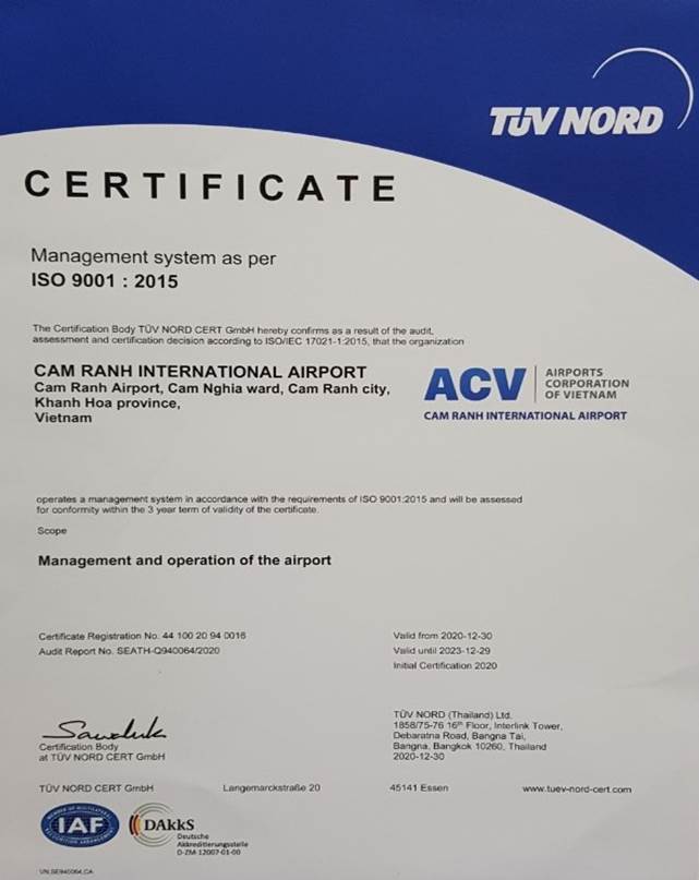 Vừa qua, Cảng HKQT Cam Ranh đã được tập đoàn TUV NORD (Cộng hòa liên bang Đức) cấp chứng nhận hệ thống quản lý chất lượng ISO 9001:2015.