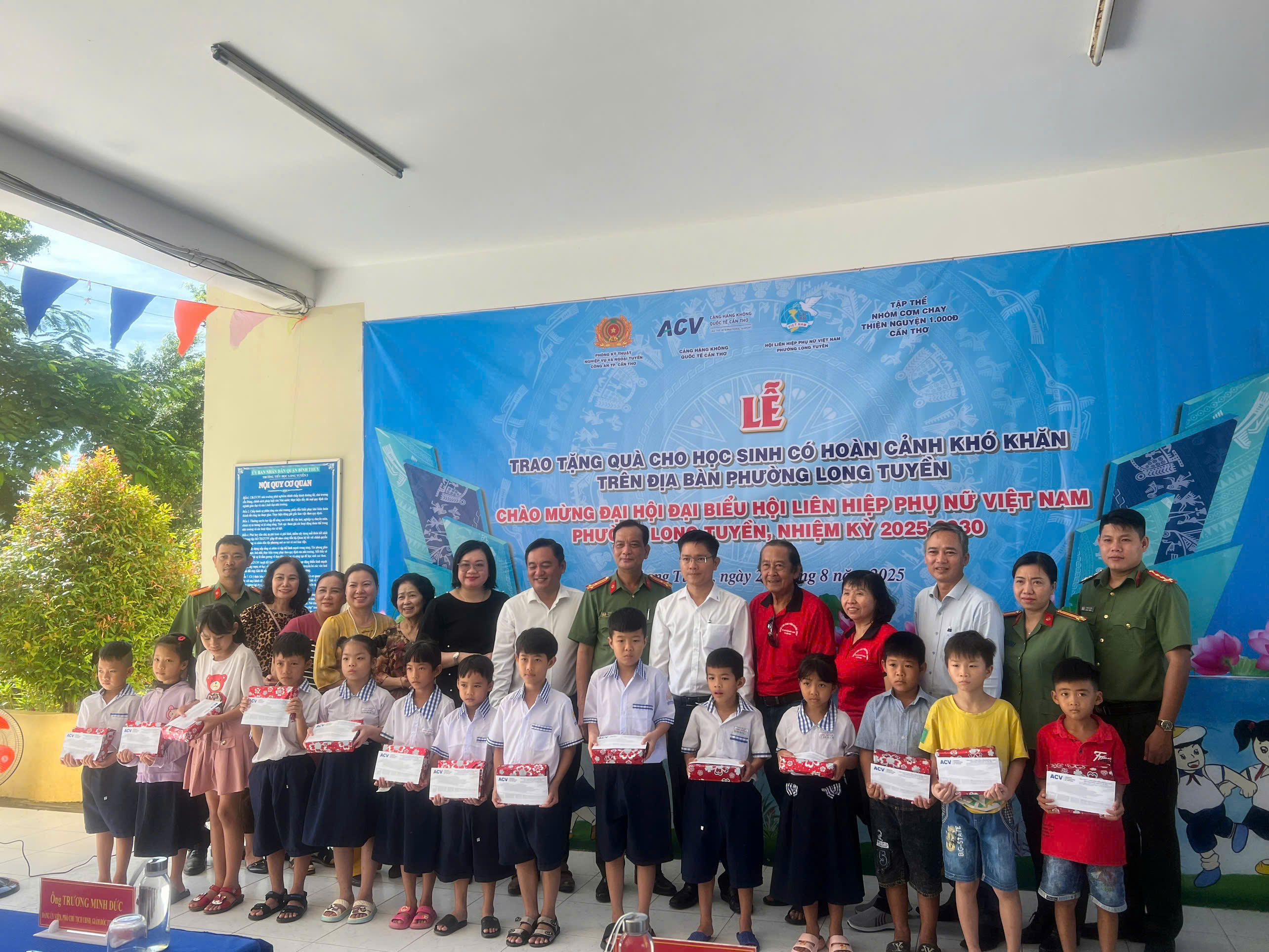 Sáng ngày 22/8/2025, Cảng HKQT Cần Thơ, Phòng Kỹ thuật nghiệp vụ và ngoại tuyến Công an thành phố Cần Thơ đã phối hợp cùng Hội LHPN phường Long Tuyền tổ chức lễ trao tặng quà cho các em học sinh có hoàn cảnh khó khăn trên địa bàn phường Long Tuyền nhân dịp năm học mới. Các phần quà đã phần nào giảm bớt những khó khăn cho các em, đồng thời động viên tinh thần để tiếp bước các em tới trường. Tại chương trình đã trao tặng 100 phần quà cho các em có hoàn cảnh khó khăn trên địa bàn phường Long Tuyền, trong đó Cảng HKQT Cần Thơ tham gia trao tặng 30 phần quà với tổng kinh phí 3,000,000đ.