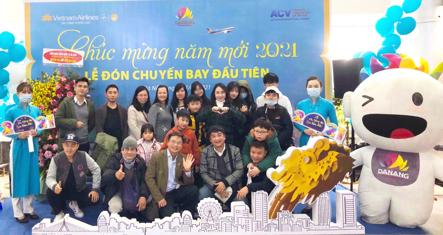 Đoàn khách du lịch trên chuyến bay đầu tiên đến Thành phố Đà Nẵng đầu năm 2021