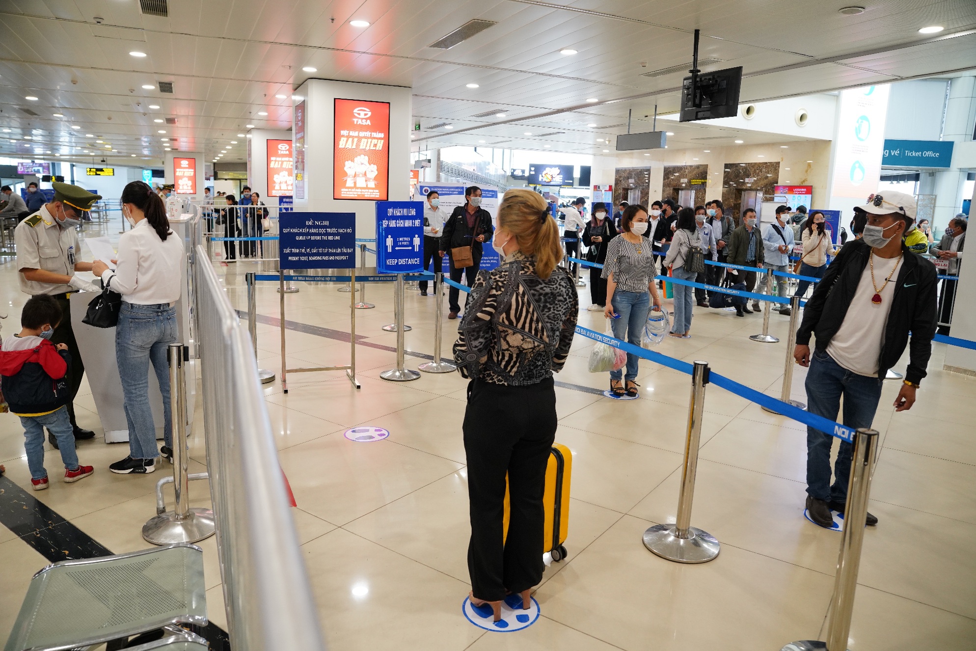 Cảng HKQT Nội Bài đã bố trí xuyên suốt dây chuyền phục vụ hành khách đi, hành khách đến tại cả hai nhà ga T1 và T2 để đảm bảo hành khách xếp hàng làm các thủ tục hàng không phải giữ khoảng cách với nhau tối thiểu 2 mét.