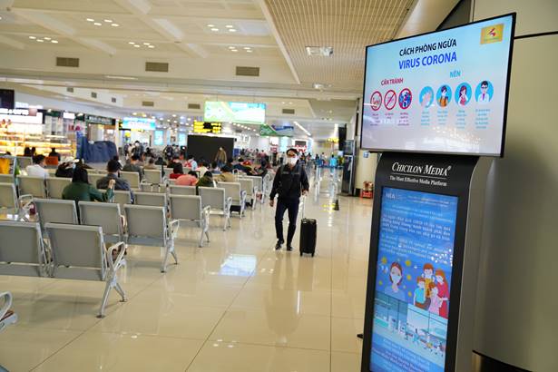 Cảng đã triển khai dán decal tại các vị trí xếp hàng khu vực soi chiếu an ninh, khu vực cửa ra tàu bay; dán decal khuyến cáo khách không ngồi vào ghế giữa tại các băng ghế 3 chỗ ngồi trong phòng chờ hành khách; bố trí cọc inox và dán decal để phân chia các lối tiếp cận với băng tải trả hành lý; Đối với khu vực check-in, đã có nhân viên của hãng hàng không và nhân viên phục vụ mặt đất đứng tại các vị trí lối vào để hướng dẫn khách xếp hàng theo quy định giãn cách 2 mét.