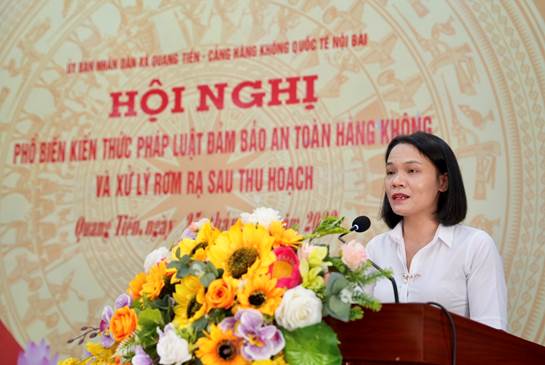 Phát biểu tại Hội nghị, bà Ngô Thị Kim Hân - Phó Chủ tịch UBND xã Quang Tiến nhấn mạnh tầm quan trọng của việc tập huấn cho bà con nông dân trong việc nhận thức tác hại của việc đốt rơm rạ đối với hoạt động bay, đặc biệt khi các hoạt động bay đã phục hồi và chuẩn bị bước vào giai đoạn cao điểm hè. Bà Hân cũng vui mừng chia sẻ rằng, thông qua các đợt tập huấn lần trước, bà con xã Quang Tiến đã triển khai sử dụng chế phẩm sinh học để xử lý rơm rạ sau thu hoạch.