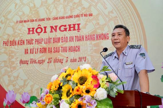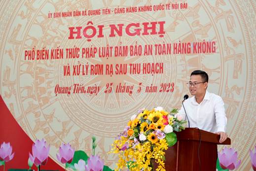 Ngày 25/5/2023, thực hiện kế hoạch thường niên về tuyên truyền văn hóa an toàn hàng không đến các hộ dân sản xuất nông nghiệp, Cảng HKQT Nội Bài phối hợp cùng Cảng vụ Hàng không miền Bắc, UBND xã Quang Tiến, huyện Sóc Sơn, Hà Nội, tổ chức Hội nghị phổ biến kiến thức pháp luật đảm bảo an toàn hàng không và xử lý rơm rạ sau thu hoạch năm 2023.