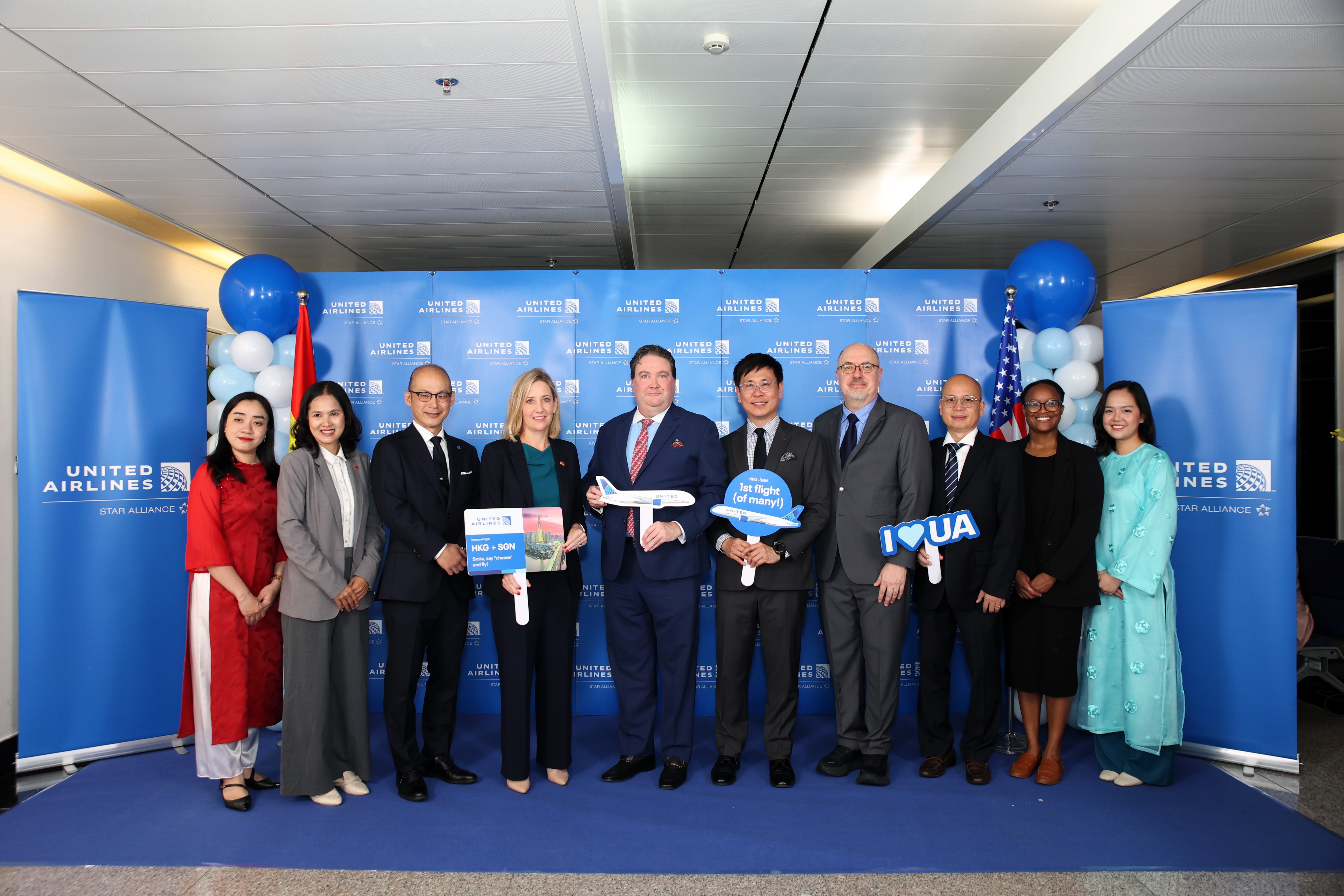 Các đơn vị chúc mừng chuyến bay thương mại đầu tiên của United Airlines tại Cảng HKQT Tân Sơn Nhất sau gần 10 năm gián đoạn