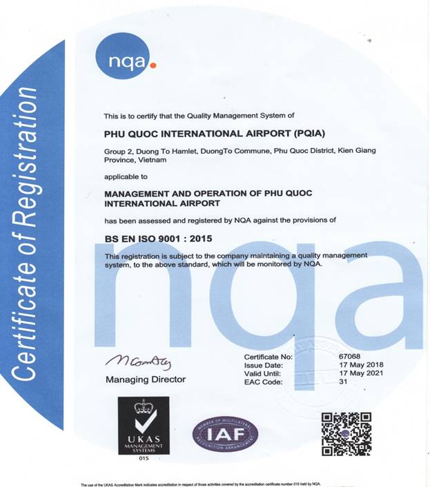 Vừa qua, Cảng HKQT Phú Quốc đã tổ chức đón nhận chứng nhận Hệ thống quản lý chất lượng đạt tiêu chuẩn ISO 9001:2015 do NQA – một tổ chức chứng nhận, giám định, kiểm định lớn hàng đầu thế giới cấp.