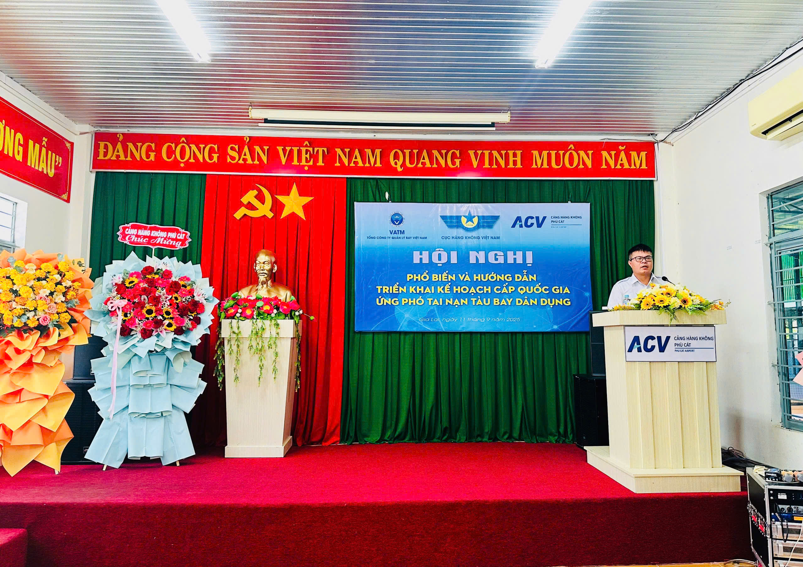 Ngày 11/09/2025, tại Cảng hàng không Phù Cát, Cục Hàng không Việt Nam phối hợp với Cảng hàng không Phù Cát tổ chức Hội nghị phổ biến, hướng dẫn các đơn vị trong ngành hàng không triển khai Kế hoạch cấp quốc gia ứng phó tai nạn tàu bay dân dụng.