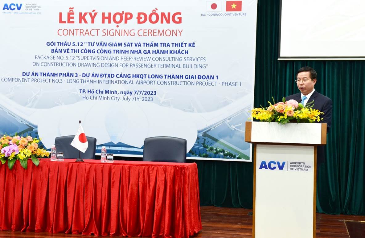 Ngày 07/7/2023, Tổng công ty Cảng hàng không Việt Nam (ACV) đã long trọng tổ chức Lễ ký kết và trao hợp đồng tư vấn gói thầu 5.12 “Tư vấn giám sát, thẩm tra thiết kế bản vẽ thi công công trình nhà ga hành khách” của dự án thành phần 3 – Các công trình thiết yếu trong Cảng hàng không thuộc dự án đầu tư xây dựng Cảng HKQT Long Thành giai đoạn 1 cho Liên danh Nhà thầu JAC – CONINCO (Japan Airport Consultants, Inc. và Công ty cổ phần tư vấn công nghệ, thiết bị và kiểm định xây dựng – CONINCO). Tham dự buổi lễ có Ông Lại Xuân Thanh - Chủ tịch HĐQT ACV; Ông Ryohei Yamada - Giám đốc điều hành, Tổng Giám đốc Ban Thương mại Quốc tế JAC; Ông Nguyễn Văn Công - Chủ tịch HĐQT CONINCO cùng các thành viên HĐQT ACV, Lãnh đạo ACV, Lãnh đạo Ban QLDA Cảng HKQT Long Thành, Lãnh đạo các thành viên trong Liên danh JAC-CONINCO.