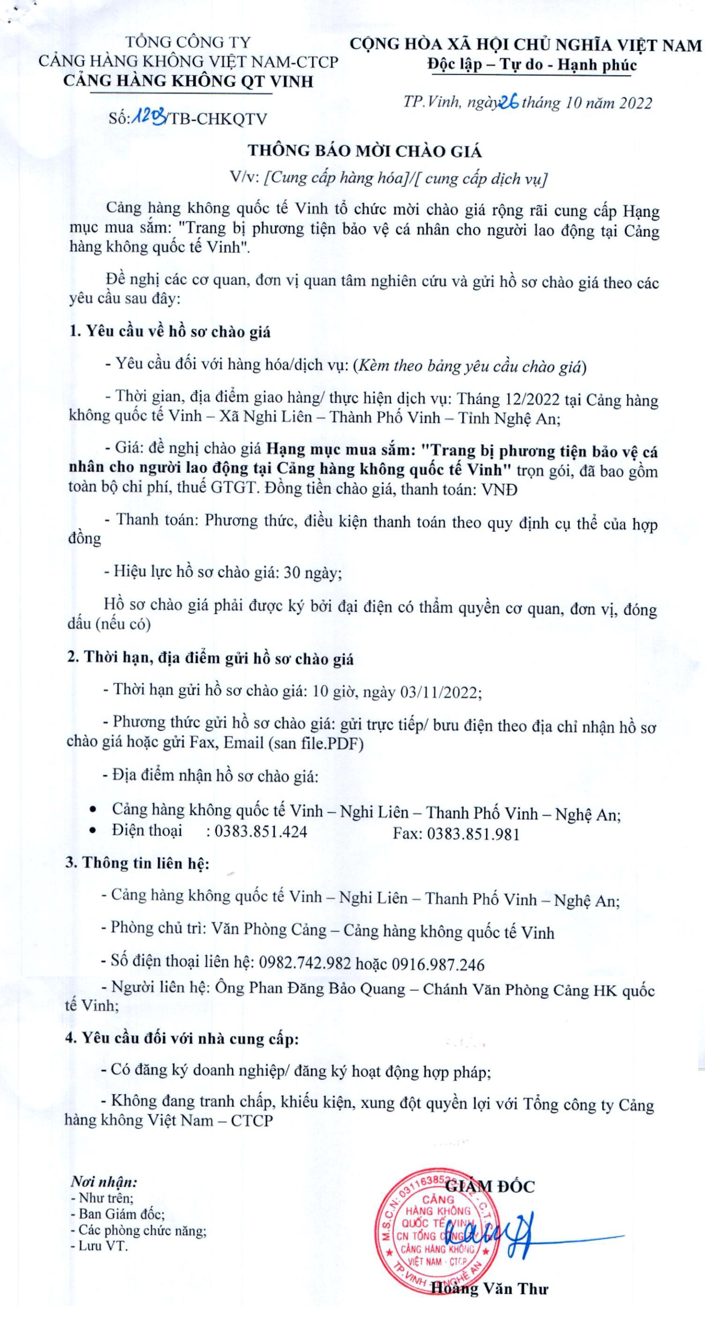 Thông báo mời chào giá về việc Cung cấp hàng hóa dịch vụ cho hạng mục - Trang bị phương tiện bảo vệ cá nhân cho người lao động tại Cảng HKQT Vinh