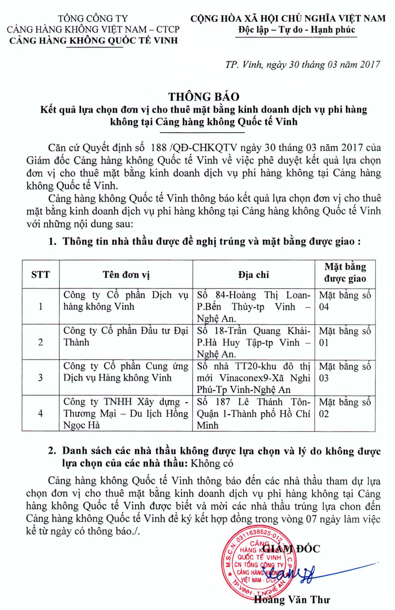 Kết quả lựa chọn đơn vị cho thuê mặt bằng kinh doanh dịch vụ phi hàng không tại Cảng hàng không quốc tế Vinh