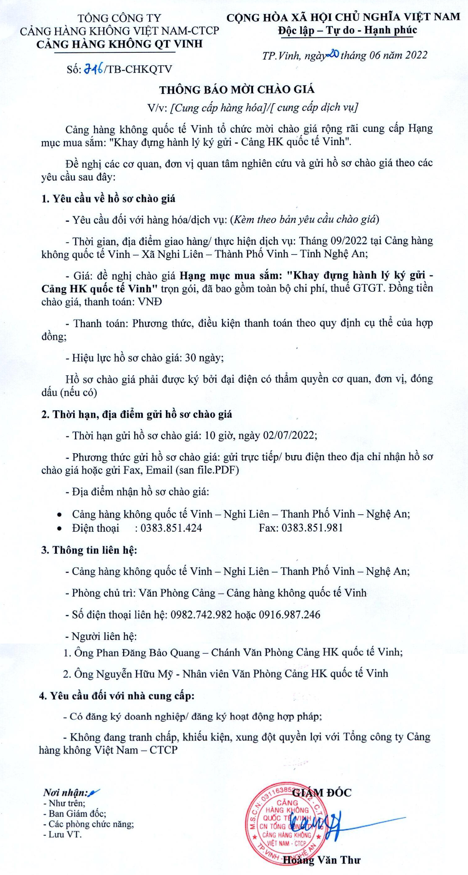 Thông báo mời chào giá về việc Cung cấp hàng hóa dịch vụ cho hạng mục - Trang bị phương tiện bảo vệ cá nhân cho người lao động tại Cảng HKQT Vinh