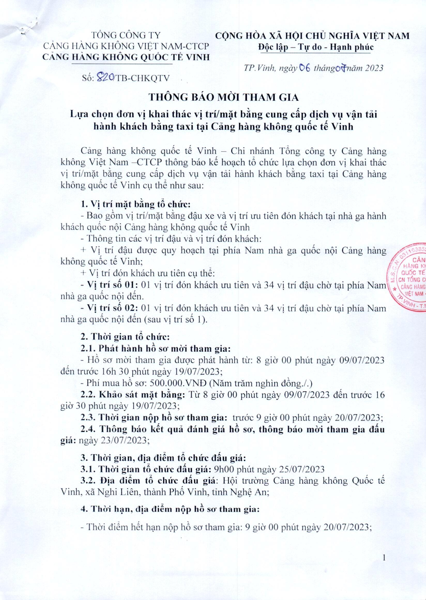 Thông báo mời tham gia Lựa chọn đơn vị khai thác vị trí/ mặt bằng cung cấp dịch vụ vận tải hành khách bằng taxi tại Cảng hàng không quốc tế Vinh