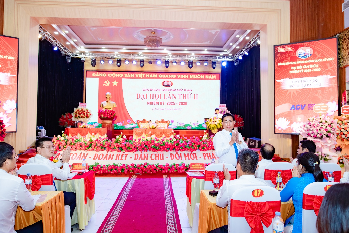 Đại hội vinh dự được đón tiếp và lắng nghe ý kiến chỉ đạo sâu sắc từ đồng chí Nguyễn Tiến Việt, Ủy viên Ban Thường vụ, Phó Tổng giám đốc phụ trách Ban điều hành Tổng công ty Cảng hàng không Việt Nam (ACV). Đồng chí đánh giá cao những nỗ lực và thành tựu mà Đảng bộ Cảng hàng không quốc tế Vinh đã đạt được trong nhiệm kỳ vừa qua, đồng thời định hướng những nhiệm vụ trọng tâm cho giai đoạn tới, phải có giải pháp, lộ trình cụ thể để thực hiện các mục tiêu đề ra, đặc biệt nhấn mạnh tầm quan trọng của việc duy trì an toàn khai thác, nâng cao chất lượng dịch vụ và phát triển bền vững. Xứng đáng là Cảng hàng không đứng đầu khu vực.